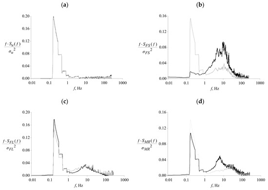 Power spectral density of (a) longitudinal velocity fluctuations, (b) side force fluctuations, (c) lift force fluctuations and (d) overturning moment fluctuations; in all diagrams, the black solid line is for model A and the grey solid line is for model B.