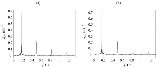 In Figure 3a, a peak at f1~0.16 Hz is observed. It is a consequence of intermittent switching between lower and higher flow velocity for 3 s each, which is in accordance with full-scale measurements, a typical feature of bora-like winds. The spectral peak at 0.16 Hz scaled up using the 1:10 time scale would represent wind gusting events lasting 60 s at full-scale. The additional harmonic components are present at n·f1, where n = 3, 5, etc., i.e., the first two other harmonics are recorded at 0.48 Hz and 0.8 Hz, a common phenomenon of ideal signals.
