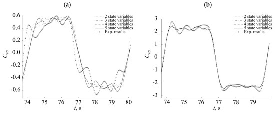 Time history of the side force coefficient; comparison of measured data against calculated time response for two-, three-, four- and five-state variable models for: (a) model A and (b) model B.
