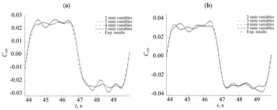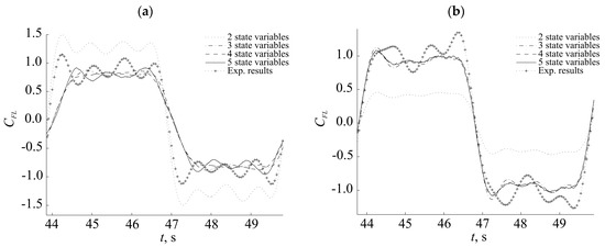 Time history of the overturning moment coefficient; comparison of measured data against calculated time response for two-, three-, four- and five-state variable models for: (a) model A and (b) model B.