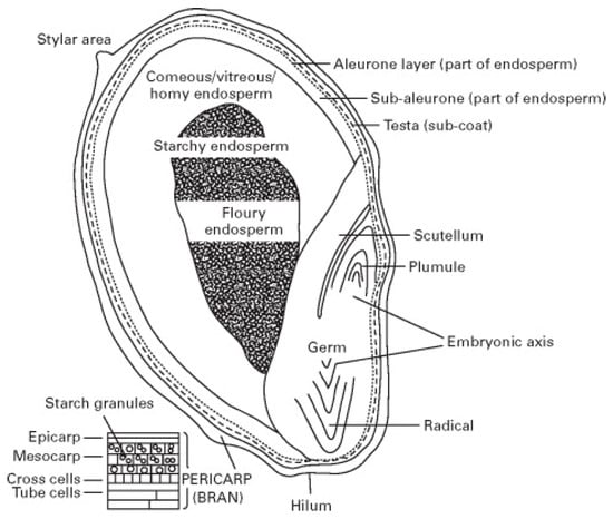 The main structural components of sorghum grain are the pericarp, germ, and endosperm (Figure 2). Sorghum grains are of the caryopsis type, with the pericarp fully merged with the endosperm. Component weights are pericarp 6%, endosperm 84%, and germ 10% [9]. Sorghum grain processing implies the partial removal and/or change of the three most important components (germ, endosperm, and pericarp), some of the techniques applied being decortication, malting, fermentation, roasting, flaking, and grinding [9].