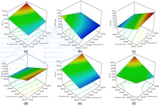 Three-dimensional graphic showing the combined effects of factors (treatment temperature and fractions) on the sorghum flour: (a) hydration capacity (HC), (b) water-retention capacity (WRC), (c) swelling power (SP), (d) oil-absorption capacity (OAC), (e) emulsion activity (EA), and (f) emulsion stability (ES).