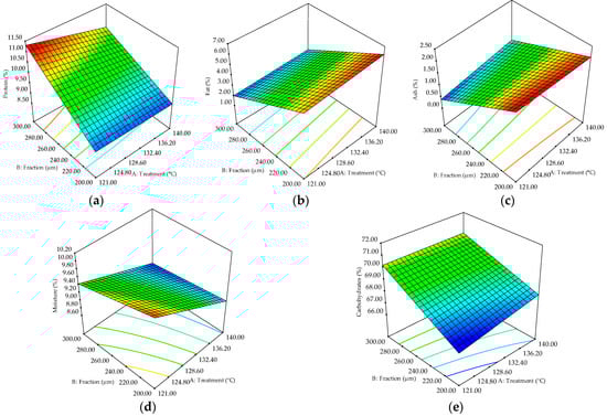 Three-dimensional graphic showing the combined effects of factors (treatment temperature and fractionation) on the sorghum flour content of: (a) protein, (b) fat, (c) ash, (d) moisture, and (e) carbohydrates.
