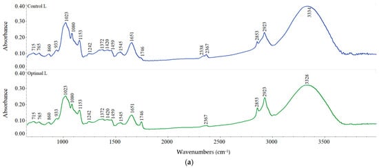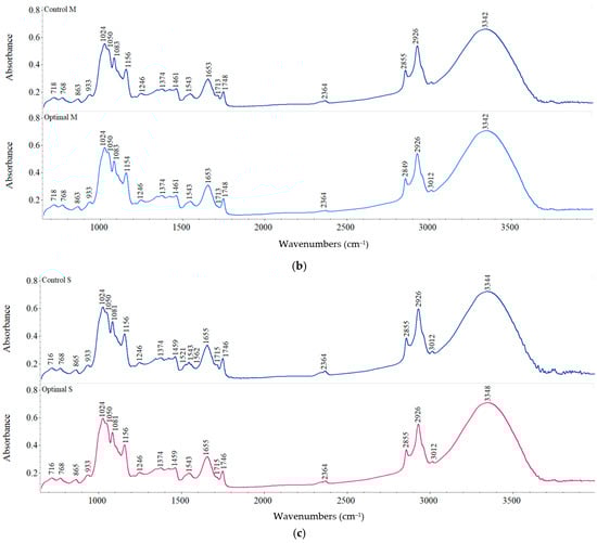 For M and S fractions, no significant changes between optimal and control samples were observed regarding peak occurrence (Figure 5b,c). Peak intensities exhibited differences among fractions, the smallest values being obtained for L fraction. The band appeared at around 3328–3342 cm−1 suggesting the O–H bond stretching from starch and protein–starch interaction and also from water molecules, alcohol, phenolic compounds, or carboxylic acid, while the modification in peak intensity indicates the degree of formation of hydrogen bonds (inter- and intramolecular) [54]. The lower intensities of peaks at 3328–3342 cm−1 for all the optimal samples compared to the corresponding controls could lead to a rise in dehydroxylation reactions upon dry heat treatment [14]. The modification of this band position towards a lower peak intensity suggests an enhancement in the bond strength caused by the interaction within starch molecules and starch with other compounds [55]. The bands observed at about 1156, 1081, and 865 cm−1 for all the studied samples suggest the presence of alcohol (C–O), anhydrides (C=O), and alkane (C–H) groups, respectively [54]. The modification in the intensities of these bands in the optimal samples could be related to the deformation of angular C–H bond, the vibration of—1–4 glycosidic bonds (C–O–C) and C–O linkages in the esters (developed between the –COOH and O–H group of protein and starch, respectively), and could have led to the appearance of new functional groups [14,54].
