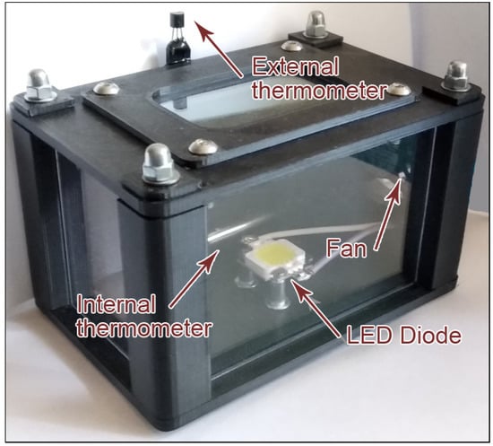 The figure shows fully the built case. One can see internal peripherals (light-emitting diode (LED), thermometer) and an external thermometer placed on the top of the case.