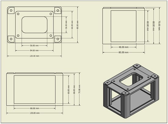 The case (Figure 2) was designed in the Autodesk Inventor and was printed using ABS material. The general idea was to build a chamber that would be partially independent of the external environment and relatively small. As air volume has a great impact on the heating and cooling time of the air inside the chamber; only a small amount of free space was left for additional new measurement instruments. Besides the aspects of functionality, we decided to consider a visual aspect and used plexiglass windows, which enabled us to look inside the case. The dimensions of the box are shown in Figure 3. The total outer case size is 120 × 80 × 70 mm.