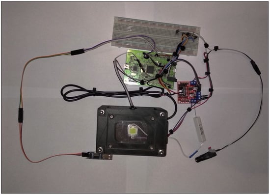 For measurement and control purposes, we decided to use the STM32F4 Discovery evaluation board, which is quite old and nowadays does not offer a great performance compared to other boards. We decided that if the solution works fine on this microcontroller, it can work even better on modern embedded platforms. Besides the board, we used two DS18B20 thermometers using a 1-wire interface, one L298N H-bridge controlled by PWM (pulse width modulation), one 40 × 40 × 10 12 V PC fan, one 10 W light-emitting diode (LED), and a PL2303HX converter, which allowed us to communicate with the board through the USART interface. One thermometer and one LED were put inside the chamber. The fan was placed on one side of the case. It allowed two goals to be reached: at low speed, it forced the airflow inside the case to equalize the temperature in the case, whereas at high speed, it cooled down the chamber. The microcontroller, H-bridge, and second thermometer were placed outside the case. We decided to use the led diode as a heater because it produces a large amount of heat and does not need a powerful power supply, which was confirmed in our internal tests in the past. The output power of the diode can be programmed to work between and . The power of the diode was reduced by a resistor, as suggested by the manufacturer. The fan can also be controlled, but in the range of to percent. The whole system is shown in Figure 4. The peripherals, which are an integral part of the case, are shown in the Figure 2.