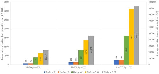 As embedded systems are called energy-saving, it is obvious that boards such as STM32F4 consume less energy than a powerful PC in general and offer less computational power. However, the question arises of what is the result of power consumption per task. We performed additional tests based on and to determine it (Table 3). We used a commercially available current clamp meter to measure the electric current and a commercially available multimeter to measure the voltage. The computation time was measured at the code level by a dedicated function. The results obtained are not particularly clear. The powerful platforms calculate the results much faster and during this time can consume less energy. If we compare Platform D (S) with Platform C, we can see that the second platform consumes about times less energy per task. It is important to note that in this case, the low-energy platform consumed more energy. The situation is different if the highly optimized code is used (Platform D (O)). STM32F4 consumes over 10 times less energy than Platform C, which confirms its usability in different tasks. The most important thing for embedded systems is to prepare the code that can be compiled as fast as possible on a used board. It is also worth noting that the energy consumption of platforms A, B, and C contains the energy consumed by the operating systems, which did not occur in the platform D cases.