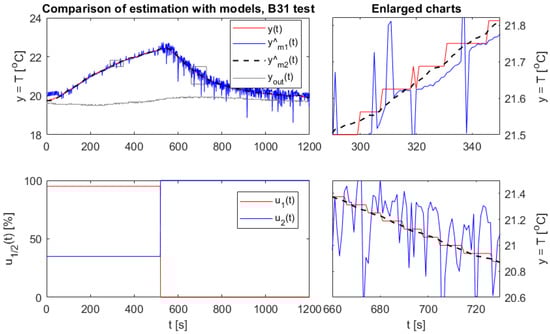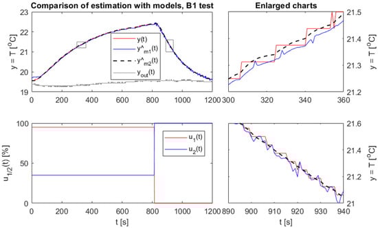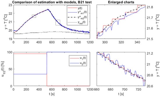 In the second part of the experiments, the heating and cooling test was performed. We prepared a scenario in which the air in the case was heated to the desired temperature. After reaching the temperature, the air was immediately cooled down to the base temperature (). The information collected online was the indoor temperature and the estimated temperature. The quality of the estimation of the data models was tested and compared to the models given by Equations (10) and (12). The results obtained are shown in Figure 6, Figure 7 and Figure 8 and are denoted as and for the systems (10) and (12), respectively. Figure A1 from Appendix A shows experiments obtained only with the use of the model (10) because these experiments were used to verify the operation of the estimation for various parameters of the particle filter—for different values of set temperatures and different noise variances. For better visibility of the range and approximations, some fragments of the charts are zoomed in on; they are marked with rectangles in the main picture.