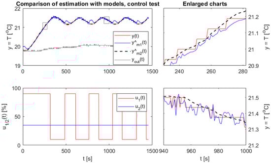 To identify the parameters of the object, tests with various amplitude step controls were carried out, during which the gain and time constant for the experiments were adjusted. Separate tests were carried out for the heating and cooling processes as different dynamic properties were then demonstrated by the models. Constant parameters were selected for the heating process (denoted by subscript h), while in the case of cooling (subscript c), the gain depends on the initial temperature that at the beginning of the experiment should be ideally equal to the temperature measured outside. The resulting parameters in the two modes are as follows: