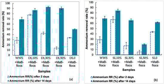 For liquid slurry, the best NH4-N removal rate by Ma-B flocs was 84.0 ± 2.9% for SL10% at the end of the culture (Figure 1b). The results suggest that the removal efficiency increases as the nitrogen concentration decreases in the effluent.
