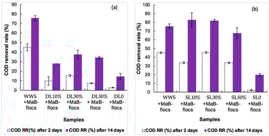 COD removal rates (mean value ± SD) evaluated after 2 and 14 days of Ma-B flocs culture for each diluted substrate. (a) DL: Liquid Digestate; (b) SL: Liquid Slurry. WWS is synthetic wastewater control.
