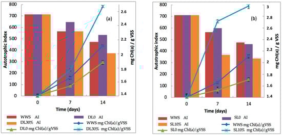 Ma-B flocs biomass productivity evaluated in terms of mg Chl (a)·g−1 VSS (mean value ± SD) and autotrophic indices after 7 and 14 days of batch culture for different substrates: (a) DL, liquid digestate; (b) SL, liquid slurry (with and without dilution) and synthetic wastewater (WWS) a control.