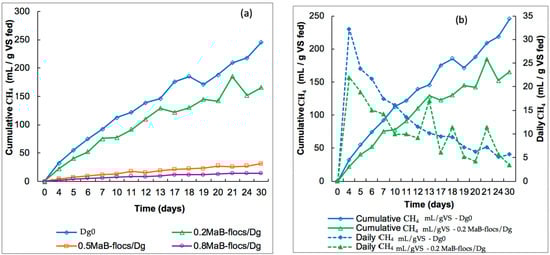 Figure 4b shows that daily methane production starts from day 1 and increases to the maximum of 32.2 and 21.9 mL CH4·g−1 VS substrate, respectively, for the digestate control (Dg0) and digestate plus Ma-B flocs digestion at a ratio of 0.2 after only 4 days.