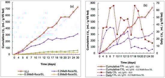 (a) Cumulative methane production from slurry as control and different ratios of Ma-B flocs/Slurry (Ma-B flocs/SL). (b) Daily and cumulative methane production for Slurry control and ratio 0.2 Ma-B flocs /Slurry.