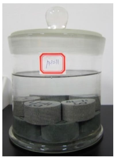 In the test, five groups of NaOH solutions with a pH of 11 were placed in glass containers, as shown in Figure 1. Ten specimens were placed into each group of chemical solutions for corrosion at 1, 3, 7, 14, and 28 d. At the end of each time gradient, 10 specimens were taken out of the solution to measure the mass, diameter, length, and other parameters of the specimens again.