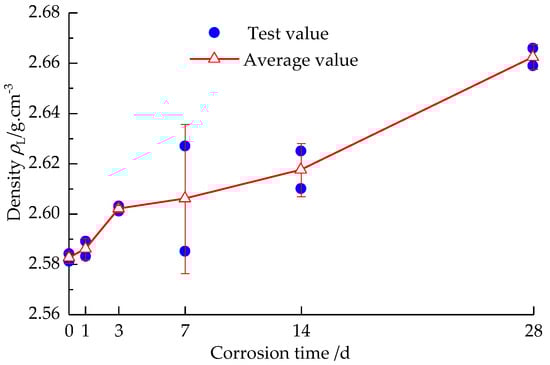 From Figure 2, it can be seen that the average density of sandstone specimen increases with the corrosion time when the strong alkali solution is corroded for 1 d–14 d, and when the corrosion is 14 d–28 d, the average density growth rate of the sandstone specimen shows a stable trend. Preliminary analysis: 1 d–14 d, the solution enters the rock fissure, resulting in the increase in density of sandstone specimen, while 14 d–28 d, the rock absorbs the solution, gradually tending to saturate; then, the density growth rate tends to be stable at this time.
