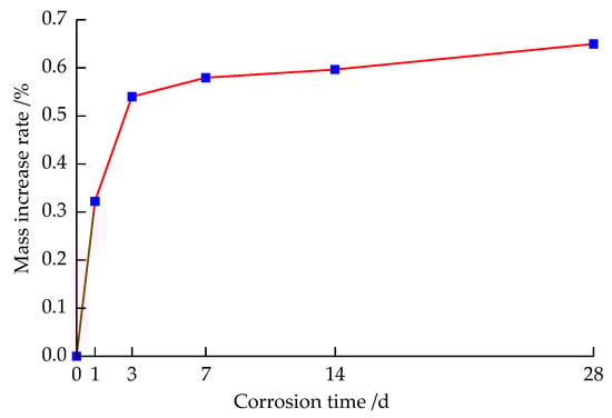 It can be seen from Figure 3 that the sandstone mass changed rapidly after placing the sandstone specimen in strong alkali solution corrosion for 1 d to 14 d. The reason is that when the sandstone specimen is placed in the solution for corrosion, the solution penetrates into the originally existing micro-pores or micro-cracks inside the sandstone, and then, the pores inside the sandstone specimen continue to expand due to chemical reactions, such as hydrolysis, between the aqueous chemical solution and some mineral components in the sandstone, resulting in a secondary micropore. The hydrochemical solution continues to penetrate into these new micropores, resulting in faster growth of the sandstone mass increase rate in the early stage; but, when sandstone was corroded for 14 d to 28 d, the sandstone mass change rate tended to level off. The reason is that the water–rock chemical reaction tended to stabilize, and the absorption solution of the internal micropore fissure in the sandstone was close to saturation. It can be seen that the hydrochemical corrosion of sandstone has a time effect.