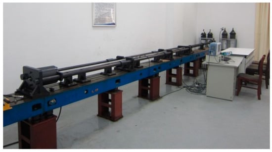 In this paper, the Hopkinson pressure bar (SHPB) apparatus was adopted from the State Key Laboratory of Mining Response and Disaster Prevention and Control in Deep Coal Mines. The SHPB test apparatus consists of five parts: impact loading system, load transfer system, data acquisition system, speed measuring device system, and preload axial compression system [26], as shown in Figure 4.