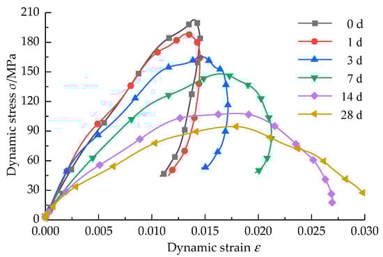 The sandstone specimens were subjected to SHPB impact compression tests after corrosion by strong alkali solutions at different times, and the dynamic stress–strain curves were obtained after treatment, as shown in Figure 5.