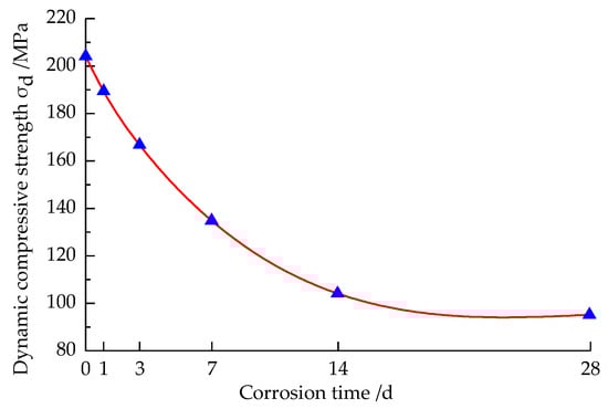 It can be seen from Figure 6 that the dynamic compressive strength of the standard sandstone specimens without corrosion reached 204.11 MPa, while the dynamic compressive strength of the specimens decreased by 7.27%, 18.36%, 34.06%, 49.14%, and 53.53% after corrosion for five different times, respectively, compared with the non-corroded specimens. It shows that the dynamic compressive strength of the sandstone specimens corroded by strong alkali solution was obviously lower than that of non-corroded specimens, that is, it deteriorated more greatly; the dynamic compressive strength of the sandstone specimens corroded by different times with the extension of corrosion time showed a sharp decline in the early stage and a steady and slow decline in the later stage, and the dynamic compressive strength of the specimens corroded at 28 d was the smallest. We compared our results with those in [1,22] and found that compared with the sandstone specimens in our study, the dynamic compressive strength of the limestone specimens decreased less with the extension of corrosion time after corrosion by a strong alkali solution. The reason for this analysis is that the main component of the limestone is calcite, which is not easily dissolved in a strong alkali solution, and only a small amount of hydrolysis reaction exists, while the main component of sandstone is quartz, which easily reacts with OH− ions in strong alkali, and with the prolongation of corrosion time, the internal microfracture pores of the sandstone increased, leading to its structural deterioration and causing an obvious decrease in dynamic compressive strength, and the dynamic compressive strength of the specimens decreased in a quadratic function relationship with corrosion time, as shown in Equation (2).