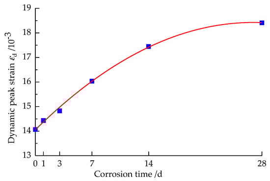 As can be seen from Figure 7, the dynamic peak strain of the sandstone specimen increases as a quadratic polynomial function with the extension of corrosion time, and the curve is fitted as shown in Equation (3).
