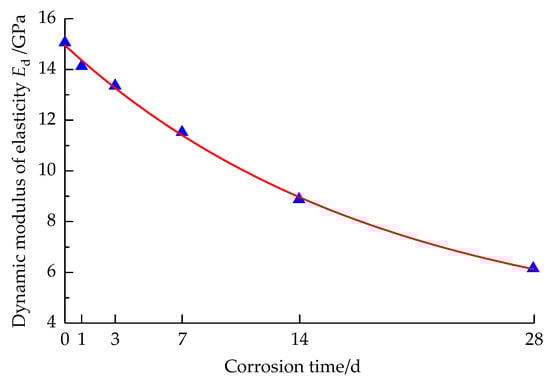 It can be seen from Figure 8 that the dynamic elastic modulus of sandstone specimens corroded by the strong alkali solution is smaller than that of non-corroded specimens. The Ed of sandstone specimens shows an overall decreasing trend with the extension of corrosion time, which is consistent with the dynamic compressive strength and reaches the minimum at 28 d of corrosion. The dynamic elastic modulus of the sandstone specimen decreases rapidly with the extension of corrosion time from 1 d to 14 d, while at 14 d–28 d, the rate of decrease in dynamic elastic modulus with the extension of corrosion time becomes smaller and gradually becomes stable, which is similar to the findings of Li et al. [22], but in contrast, under the same corrosion time conditions, the pre-decrease in dynamic elastic modulus of the sandstone specimens under the strong alkali solution corrosion was significantly greater than that of the limestone specimens. By fitting the variation trend of the dynamic elastic modulus of the sandstone, it is found that the dynamic elastic modulus of the sandstone specimen has an exponential term relationship with corrosion time, as shown in Equation (4).