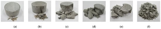 As can be seen in Figure 10a, the specimen was in the splitting tensile damage when the stress was small, and the specimens were relatively intact as a whole; compared with Figure 10a, after 1 day of corrosion, the specimens were slightly less intact as a whole, and the number of fragments increased from one to four–five; with the extension of corrosion time, in Figure 10c–e, the fragmentation of the specimens increased, the number of fracture surfaces and fragments increased, and more small-sized fragments were created; comparing Figure 10b–e, it can be observed that with the prolongation of corrosion time, the sandstone specimen as a whole showed a trend of spalling-type damage from the outside to the inside, while in Figure 10f, the specimen was more obviously crushed by the impact crushing effect, and the damage pattern of the specimen shows that there are basically only small-sized fragments and granular debris.