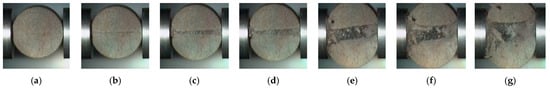 From Figure 14a–c, it can be seen that the number of specimen fragments is small when the specimen from 1 d to 3 d of immersion, the sandstone specimen splitting damage of the more complete two parts of the area change, is not very obvious. While comparing Figure 14d–f, two end faces at the local crushing area and the local crushing area with the corrosion time extension gradually increase. In addition, in the immersion at 7 d–28 d, the specimen splitting damage form is shown. The specimen damage degree increases, and the number of small-sized fragmentations with the extension of corrosion time increase.