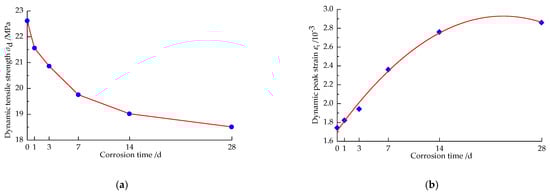 The changes of dynamic tensile strength and dynamic peak strain of sandstone after different times of corrosion by the strong alkali solution are shown in Figure 13a and Figure 13b, respectively.