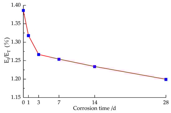 The variation curve of the ratio of transmitted energy to incident energy with corrosion time is shown in Figure 15.