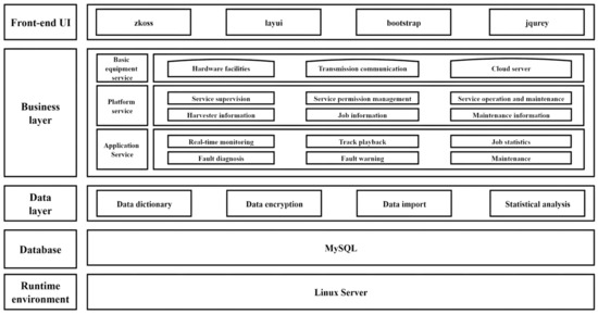The combine harvester remote operation and maintenance platform should be deployed on the cloud server. Facing the remote operation and maintenance service link of combine harvesters, the platform was based on the Zkoss architecture of the Web platform. It integrates big data, Internet of Things, Web GIS, and other technologies. It can perform real-time monitoring, fault prediction and diagnosis, and comprehensive operation maintenance of the operation information of the combine harvester. It further realizes the intelligent management and operation and maintenance of the combine harvester. The overall architecture of the combine harvester remote operation and maintenance platform is shown in Figure 2. According to the logical association, it is divided into front-end UI and display layer, business layer, data layer, database, and operating environment.
