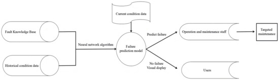 Fault prediction is an important feature to distinguish intelligent operation and maintenance from traditional operation and maintenance. The fault features and data provided by all previous stages are comprehensively used to analyze, train, and determine the state based on the neural network [32]. In turn, it evaluates the health of the combine harvester and produces a fault diagnosis record. It determines the probability of failure to enable failure prediction of the combine harvesters. Fault prediction has successfully transformed the traditional operation and maintenance of “after the sheep” into a predictive and targeted guarantee operation and maintenance. It achieves the purpose of prolonging the life of the combine harvester. The failure prediction flowchart is shown in Figure 5.