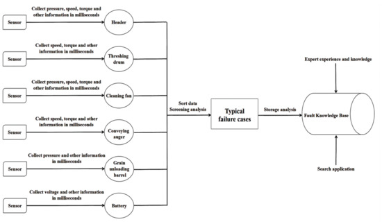 Domestic research started late. Most of the existing research [3,20,21,22,23] systems were aimed at single-vehicle operations. Among them, information collection, processing, and analysis were all completed by the vehicle terminal. For example, Chen Si of Jiangsu University had developed a remote video-monitoring and fault-monitoring system for combine harvesters. It used the WCDMA network as the wireless transmission network to realize the long-distance transmission of data. The fault solution was fed back to the airborne terminal through the remote-monitoring center to help the on-site staff in troubleshooting [24]. Li Bin et al. designed a remote-monitoring system based on GPS and GPRS. It could realize functions, such as data communication and analysis, data storage and query, real-time display of the position of the agricultural machinery, and track playback [25]. Peng Bo et al. developed a farm SMS center system integrating GPS positioning and wireless communication functions. This could solve the problems of low efficiency and poor timeliness of agricultural machinery operations in China. It could reasonably schedule agricultural machinery according to the actual production conditions of agricultural machinery [26]. The Institute of Remote Sensing of Peking University designed a set of agricultural-machinery-monitoring and management system. It realized the real-time operation monitoring of agricultural machinery, the collection of agricultural multi-source information, and the simple functions of agricultural machinery scheduling [27]. The Bei’an Administration Bureau designed and developed a set of agricultural machinery operation supervision management and service system. It was based on B/S network transmission for Heilongjiang Agricultural Reclamation Hongxing Farm [28,29]. Lovol Heavy Industry Co., Ltd. had built an IoT cloud service system for agricultural equipment, which realized functions, such as service fleet scheduling and remote diagnosis of agricultural machinery. It developed the “Zhi Nong Lovol” APP, which was convenient for users to obtain vehicle condition information, operation information, and fault information through smart phones in a timely manner [2]. The whole agricultural mechanization cloud service platform was developed by the China Academy of Agricultural Mechanization. It could realize the functions of agricultural machinery operation data monitoring, operation quality statistics, task scheduling, etc. It was suitable for various types of agricultural machinery and equipment, such as sowing, plant protection, and harvesting [30]. In summary, at present, domestic combine harvester operation monitoring, automatic driving, and other information technologies have been initially developed and applied. System functions are more focused on monitoring. However, due to the lack of remote operation and maintenance means, the application of operation and maintenance technology lags behind, especially in the research blank stage of fault diagnosis and operation maintenance. It cannot meet the requirements of high reliability operation of agricultural machinery. In addition, the remote operation and maintenance logic and configuration of the combine harvester are complex. The degree of automation is seriously insufficient. The maintenance and management are difficult and more challenging.