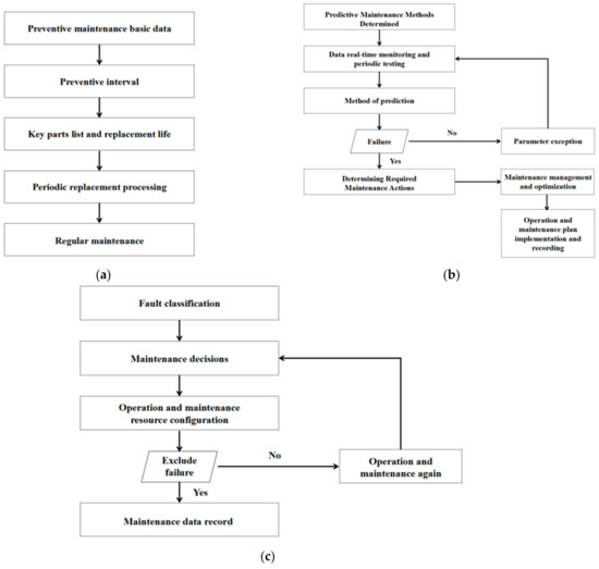 Combine harvester maintenance process: (a) preventive maintenance; (b) predictive maintenance; (c) fault repair.