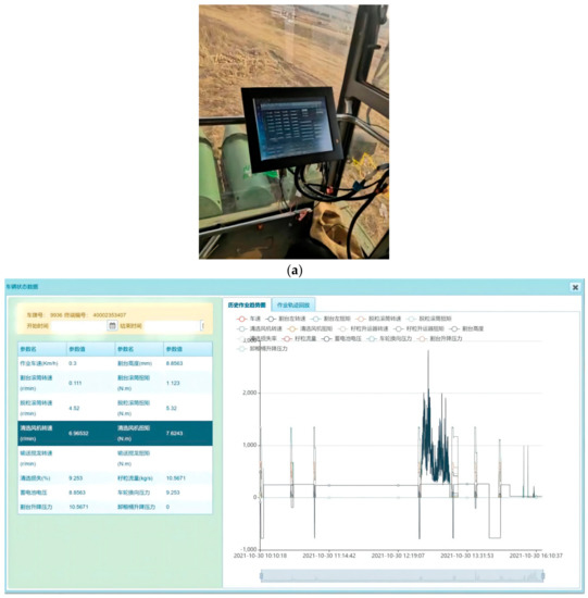 The equipment remote operation and maintenance technology use the Internet of Things, cloud technology, wireless communication [7], neural network, and other technologies to collect equipment operation data. It realizes the functions of fault diagnosis, fault prediction, component status assessment, and operation maintenance. It has become an important means of value-added services in the equipment manufacturing industry. The development of remote operation and maintenance technology is key to improving the application of equipment, especially for the complex operation equipment of combine harvesters. The research on the intelligent control, real-time positioning, and remote-monitoring technology of the combine harvester in foreign developed countries started earlier. The high degree of intelligence and automation of the combine harvester had been realized [8,9,10]. John Deere, the American company, developed the MyJohnDeere product and service platform. It was used to improve the efficiency and time of machine operation, logistics management, and agricultural decision-making, etc. It had the functions of online query of agricultural machinery operation position, statistical analysis of agricultural machinery operation data information, agricultural machinery operation efficiency calculation and operation cost accounting, etc. It realized the precise management of agricultural machinery operation [11,12]. CLAAS, the German company, applied the Trimble network smart farm system in agricultural production. It adopted wireless communication technology to realize the mutual communication between agricultural machinery and agricultural machinery and agricultural machinery and remote management center. This formed an agricultural Internet of Things system, which could efficiently manage agricultural machinery operations, agricultural machinery mobilization, etc. [13,14]. The intelligent cabs of the TUCANO series harvesters of the German CLASS Company and the 30 series harvesters of the Dutch Keith Company were equipped with electronic-monitoring display screens. It could display the working status of the harvester parts in real time and centrally control the harvester [15]. The British Massey Ferguson Harvester Company had developed a combine harvester farmland star system. It could detect the working failures of the combine harvester in time and issue an alarm prompt, which greatly reduced the failure rate of the combine harvester [16,17]. Japan’s Kubota Company designed an intelligent-monitoring device by integrating electronic-sensing technology, a display device, a positioning system, a geographic information system, and a remote-sensing measurement and control system. It was applied to the combine harvester, and the intelligent-monitoring function of the combine harvester during the harvesting process was realized [18]. In addition, Nataraj E S et al. developed a microcontroller-based embedded system with a digital display and audible warning units [19].