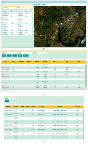 The platform could monitor the real-time machine operation information and display the machine operation trajectory. In the form of a table, the detailed historical working condition information of the terminal was displayed. The data changes of each monitoring point were displayed in the smallest granularity. When the server received the job data uploaded by the terminal device, it automatically analyzed the job data. It could automatically identify the abnormal operation status and automatically generate the fault diagnosis records. Subsequently, the administrator would comprehensively judge the real fault response of the working vehicle in combination with relevant information. The platform assigned relevant operation and maintenance personnel, arranged operation and maintenance personnel to repair the faulty vehicle, and recorded the repair results. The platform could realize the core functions of data monitoring, fault prediction, fault diagnosis, and comprehensive operation maintenance. This ensured that the combine harvester was always in the best condition, maximized production efficiency, and maintained a high quality of work.
