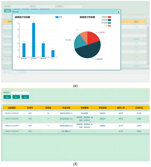 Platform function test: (a) start combine harvester vehicle terminal; (b) data monitoring interface; (c) failure prediction interface; (d) fault diagnosis interface; (e) fault diagnosis interface; (f) job maintenance interface.