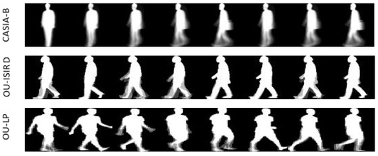 Sample GEIs obtained from different datasets, CASIA-B (first row), OU-ISIR D (second row), and OU-LP (third row).