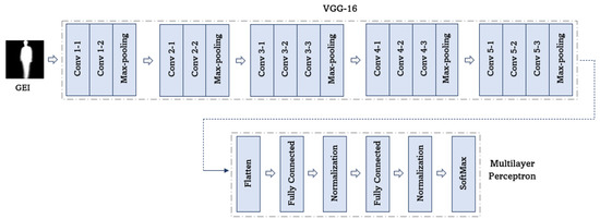 The binary human silhouettes throughout the gait cycles are first captured in the gait energy image. Subsequently, the gait energy image is passed to the pre-trained VGG-16 model for fine-tuning. The output from the VGG-16 model is the feature map that encodes the low-level and high-level representation of the gait energy image. The multilayer perceptron then learns the relationships between the feature map and the associated class. Lastly, a classification layer returns the class probability distributions. The final class label corresponds to the class with the highest probability.