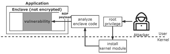 A typical code-reuse attack is a return oriented programming (ROP) attack. The ROP attack uses instruction sets called gadgets that are a series of instructions ending with ret instruction. Since all the gadgets are already contained in the victim binary, attackers do not need to inject new executable codes []. Furthermore, refs. [,] demonstrated that BLX, a branch instruction of ARM CPU, and jmp can be ending instructions to constitute a gadget. In addition, ref. [] proposed Sigreturn Oriented Programming (SROP) using the restore_sigcontext() function that is used to process signals in kernel mode for restoring stacks after a context switch. Ref. [] proposed Blind ROP (BROP) that performs ROP attacks by analyzing binary’s memory space features without direct access to the source code or binaries. Refs. [,,,,] took the control flow of the process within enclaves by using the ROP. However, the methods proposed in previous studies require detailed analysis of the enclave software because it is essential to know how the software processes the protected data. This makes it very hard to carry out ROP attacks when the source code is not available. In addition, when the ROP payload is injected, a number of gadgets runs sequentially, making it difficult to perform complex tasks such as communication with the outside of the enclave.