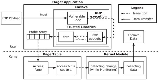 However, SGX was not designed to defend against code-reuse attack, so its effectiveness depends on the security implemented by SGX application developers []. As a result, various studies have successfully demonstrated a code-reuse attack. ROP can be used at the stage of injecting the attack code in both micro-architectural timing attacks and controlled-channel attacks, which are two representative methods of attacking SGX. Micro-architectural timing attacks first record the access speed of hardware components such as the buffer, cache, input and output ports, as well as encryption engines. Then, they analyze any access time differences to infer protected data [,]. This attack often suffers from noise-related inaccuracies due to unpredictable system events and/or access speed variations. A controlled-channel attack is analyzing memory access patterns or memory contents through channels that an attacker can control such as page faults [,,,,,].