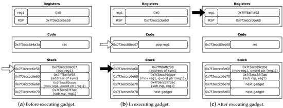 In Figure 4a, executing the ret instruction makes the control flow return to the address that is loaded in the rsp register. The rsp register has the next gadget address. After returning, the next gadget (pop reg1) is executed as shown in Figure 4b. After executing pop reg1, the address of the sync is loaded in reg1, as shown in Figure 4c.