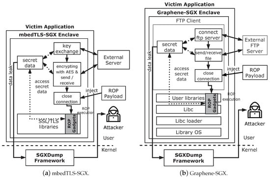 Figure 6a depicts how an mbedTLS-SGX-supported client works when communicating with a remote server and how an SGXDump attack is carried out. We did not draw detailed behaviors from TLS communications to gain a better understanding of how to implement the SGXDump attack.
