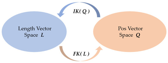 Considering the one-to-one correspondence between each vector in space Q and space L, the indicator is set as the Euclidean distance of the difference vector between and (is the length vector of q which is found by SA–PSO, is the given length vector), while (10) describes the indicator. When the indicator meets the accuracy requirements, the solution is considered to be generally obtained. More importantly, the Euclidean distance fitness can be regarded as a sign of the success of optimization.