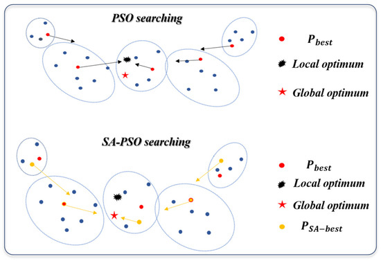 The SA–PSO algorithm is introduced by the following Algorithm 1. The difference between the standard PSO and SA–PSO is the selection of the individual optimum.