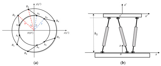 The distribution of platform hinge points is shown in Figure 4, the origin of the moving coordinate system is located at the center of the upper surface of the top platform, and the origin of the global coordinate system is located at the center of the circle where the center point of the lower hinge is. Due to the symmetry of the SGP structure, the following parameters are enough to define the platform: radius and of top and base circumscribed circle of hinge point, the angle between adjacent hinge points and and distance , from upper and lower hinge points to the top platform surface. The SGP can be uniquely determined by the above six parameters. The parameters of the top and base platform for simulation are set as follows: