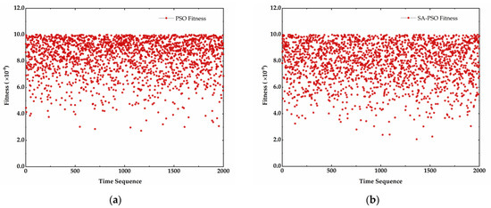 The fitness for the continuous trajectory. (a) Fitness of PSO. (b) Fitness of SA–PSO.