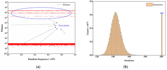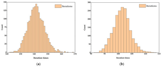 The histogram of iterations for the continuous trajectory. (a) Iterations of PSO. (b) Iterations of SA–PSO.