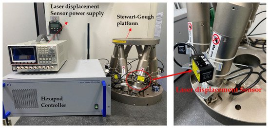 To demonstrate the applicability of the SA–PSO method, experiments are carried on the Stewart–Gough platform H-850 with six laser displacement sensors calculating the length change of six outriggers. The experimental platform is shown in Figure 10. The measurement accuracy of the laser displacement sensor is , and its measuring range is . The hexapod platform can be controlled by a moving signal from the controller, and the parameters of it are illustrated in Table 9.